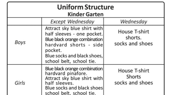 All students are required to adhere strictly to the norms of school uniform without fail as they are meant to inculcate a feeling of equality and sense of belonging to the Institution. School uniform indicates uniformity in dress, tie, belt, shoes, socks, I.D. Card etc. Students are to be smartly dressed and uniform should be clean and well-pressed.